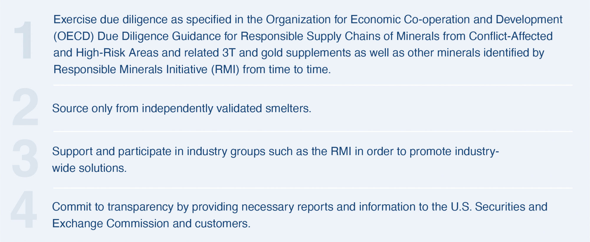 The fundamental components of the resulting due diligence responsibilities include establishing a risk management system to identify, prevent, or minimize the risks associated with human rights violations and environmental harm. Furthermore, the Act mandates companies to implement preventive and corrective measures, establish a transparent complaints procedure, and provide regular reporting. These due diligence obligations extend to our own business operations, the activities of contracting parties, and, when necessary, the actions of additional indirect suppliers. Vishay diligently fulfills all these obligations, underscoring our dedication to upholding human rights.