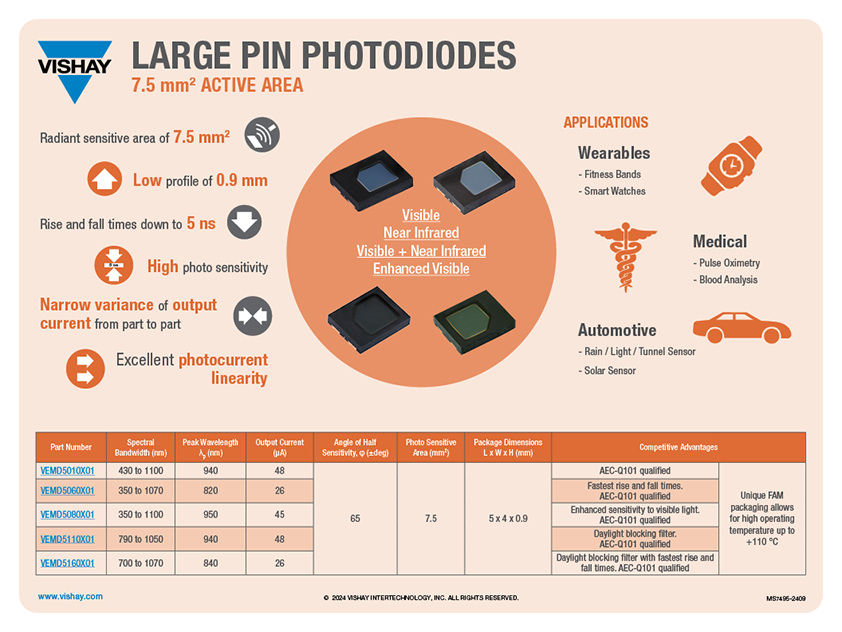 In many applications the intensity of the light, be it visible, infrared, or a combination of the two, is very low. Most applications need a high ratio of signal to noise, the higher the better. If the intensity can't be increased, the area of the photodiode becomes a critical factor. The larger the area, the greater the output current or signal. In wearable applications, for example, the amount of light reflecting off the skin layers can be very low, so large area photodiodes are key.