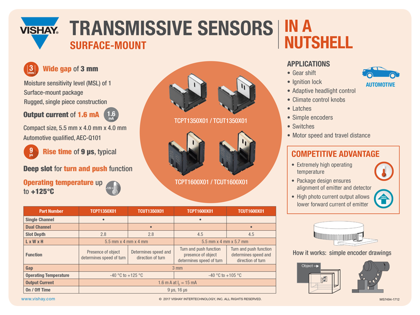 Also known as slotted interrupters or photo-interrupters, Vishay's transmissive sensors operate at higher temperatures than our competitors. In conjunction with a code wheel, they sense presence, motion, and direction of motion, and now offer a vertical push function.