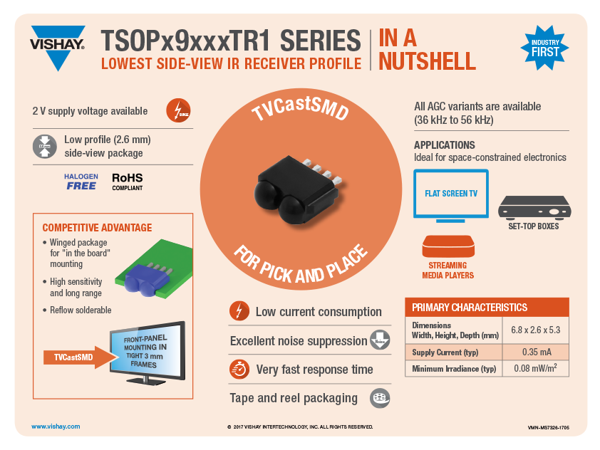 New series of miniature infrared (IR) receiver modules for IR remote control applications in flat-panel TVs and monitors for superior remote control performance. For front mounting in 3 mm frames the TSOP39xxxTR1 and TSOP59xxxTR1 series devices are industry first; offered in the TVCastSMD side-view, winged, surface-mount package with an ultra low height of 2.6 mm.
