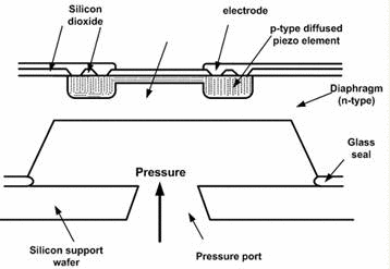 The simplest form of piezo-resistive silicon sensors are diffused resistors. Piezo-resistors consists of a simple two-contact diffused n-type or p-type wells within a p-type or n-type substrate diaphram, in contact with a silicon support wafer. The external pressure is transmitted to the diaphram through a pressure port.