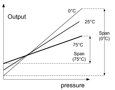 The output voltage of the piezo-resistive sensor changes proportionally with the differential pressure. However, the voltage span decreases with the temperature. As a consequence, the sensitivity decreases with temperature (typically between -0.11%/°C and -0.21%/°C).