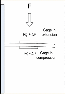 Under the effect of mechanical force (or pressure), the strain gauge on the above surface of the carrier is in extension with a positive R drift. The gauge at the other side is in compression and exhibits the same resistance drift but in the negative direction. This combination can double the sensitivity of the measurement.